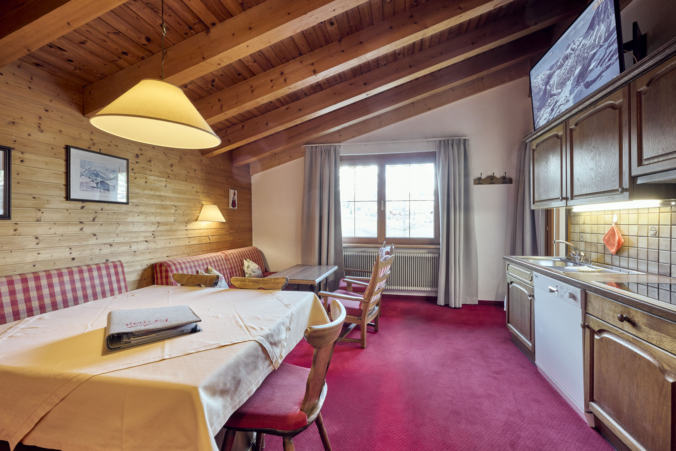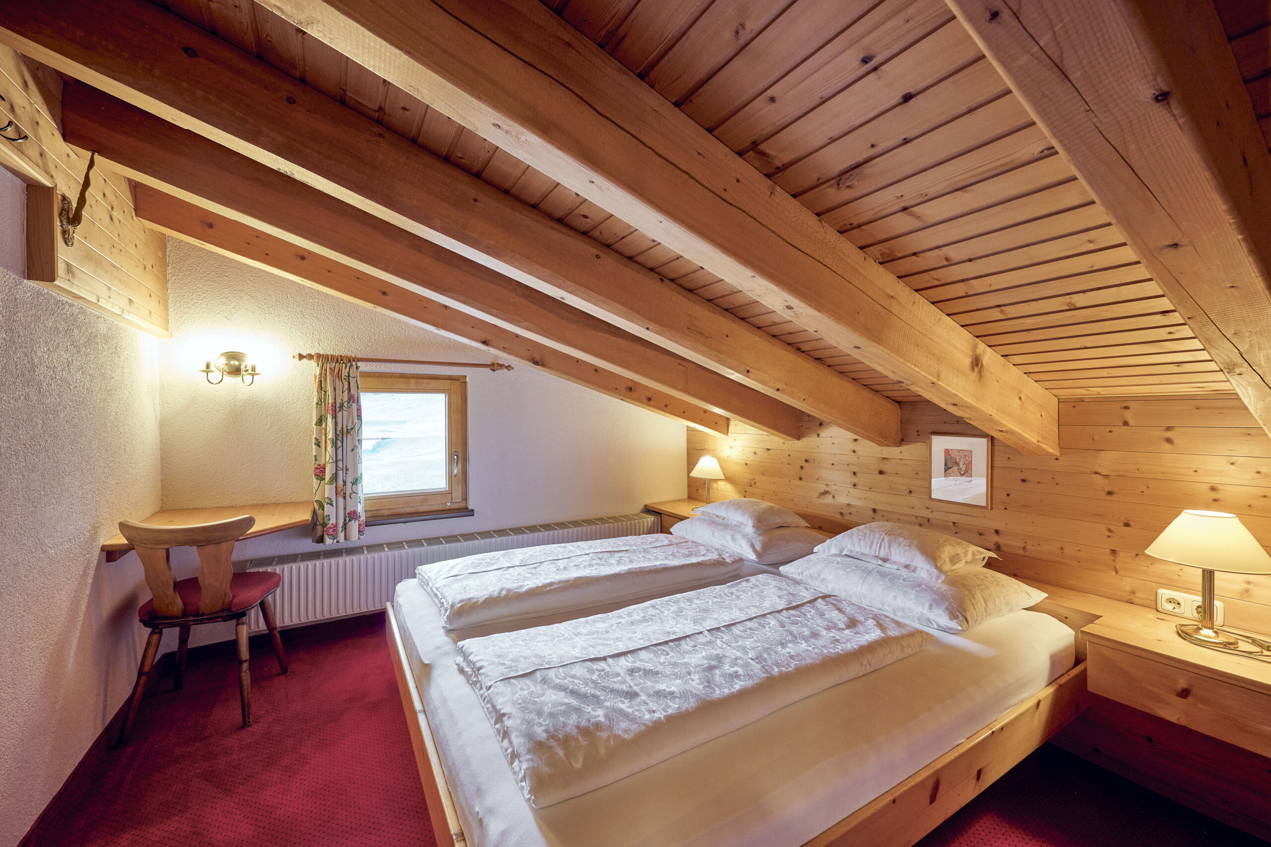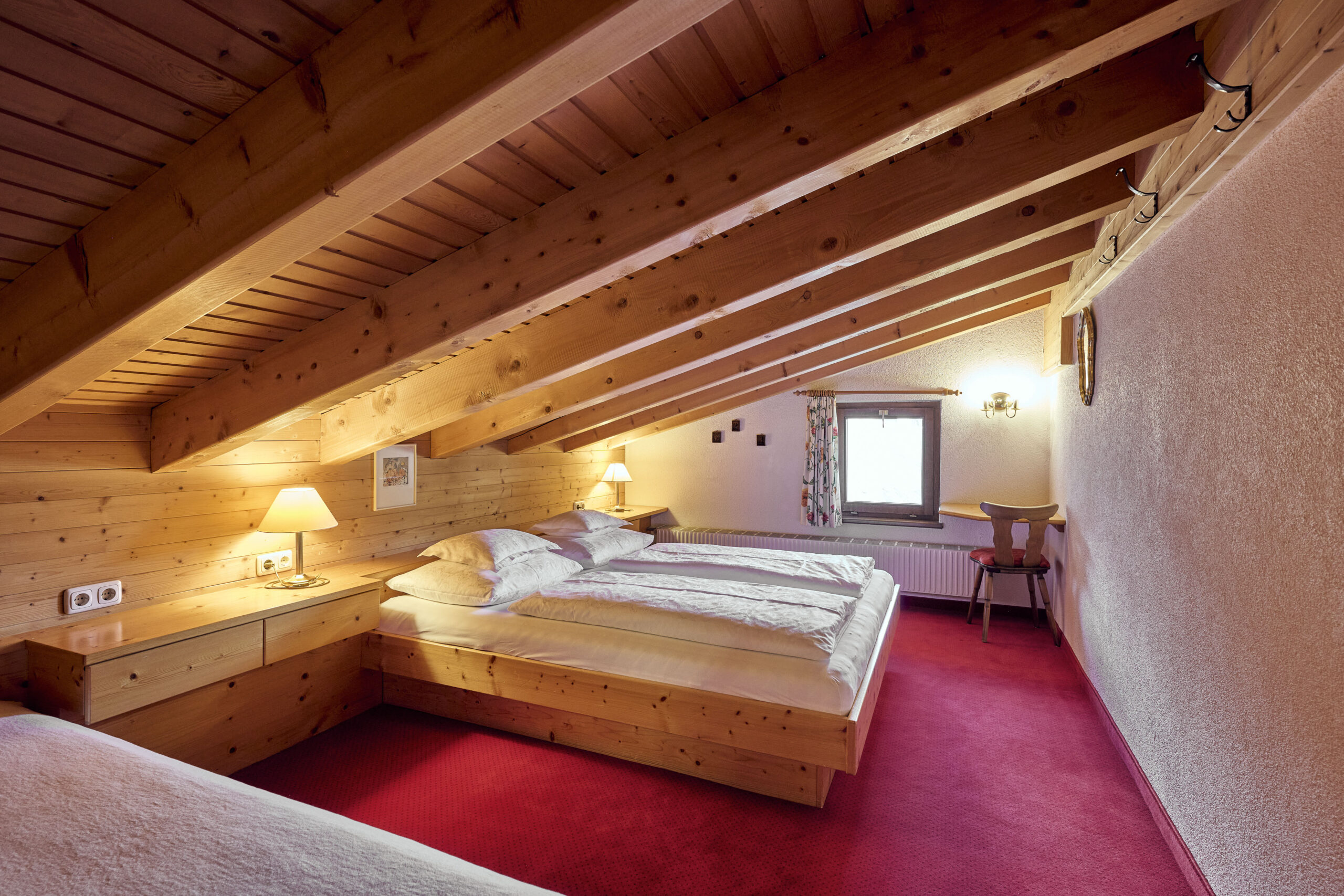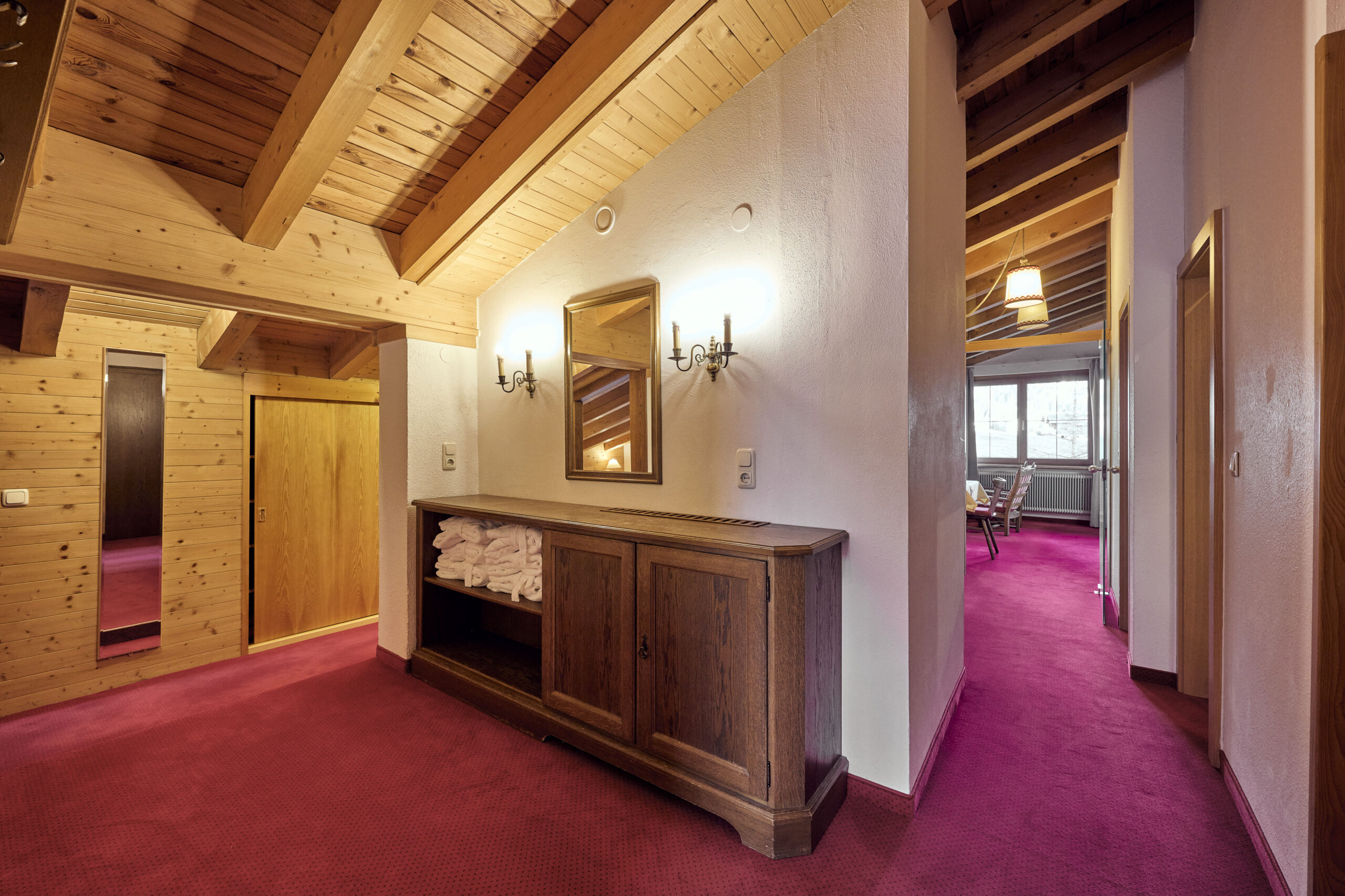 Appartement „Alpenrose“ (Typ 5), im Haus Holiday, 95 m². Komfort-Appartement einem Zweibett-Schlafzimmer und zwei Dreibett-Schlafzimmer mit Dachschräge (1,70 m Höhe). Zwei Bäder, mit Dusche und Bad, Doppelwaschbecken, getrenntes WC. Ein großer Wohnraum mit Esstisch und großer, gemütlicher Couch. Süd-Balkon. Für sechs Erwachsene (und zwei Kleinkinder bis 6 Jahre).